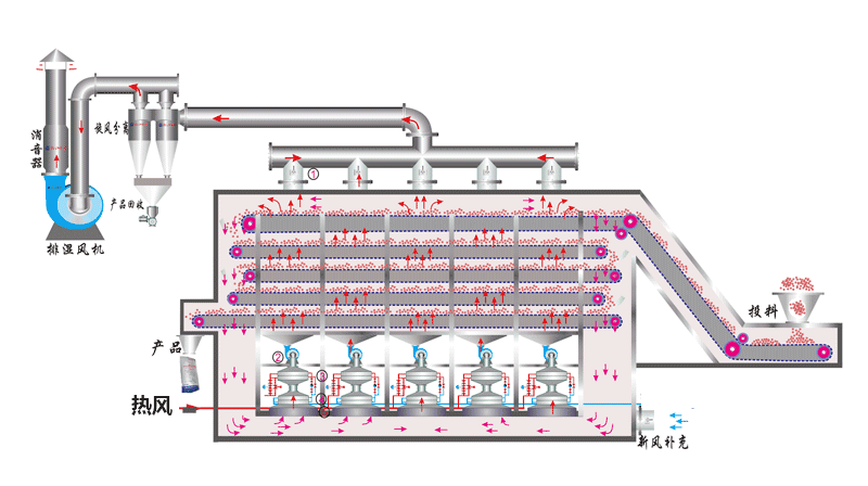 帶式干燥機主要由進風單元、排風單元、循環(huán)風單元、網(wǎng)帶、加熱系統(tǒng)、加料器、傳動機構、控制系統(tǒng)等部件組成。物料由撒布機均勻地鋪在網(wǎng)帶上,網(wǎng)帶采用12-60目不銹鋼(或碳鋼)絲網(wǎng),由傳動裝置拖動在干燥機內(nèi)移動,干燥段由若干單元組成,熱空氣通過風機穿過物料層,完成熱量與物料的交換過程,含水量較大的氣體由排風機排出。